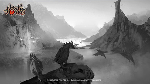 这幅原画主要是对游戏中的生态场景进行还原,黑白色调展现了游戏世界中的战斗基调,起伏的山脉,展翅的飞鸟,延绵的河流,看似和平的画面又不乏危机四伏的神秘感,不禁想进入这个异世界一探究竟。