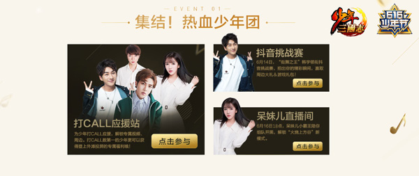 去年的少年节由张碧晨、草莓、冯提莫和陈一发为玩家带来了丰富的狂欢活动,而今年的616将更加高潮不断,全新的“热血少年团”将开启一系列的线上活动,韩宇抖音挑战赛、呆妹儿小霸王互动直播等内容将陆续登场,更多精彩,敬请期待!