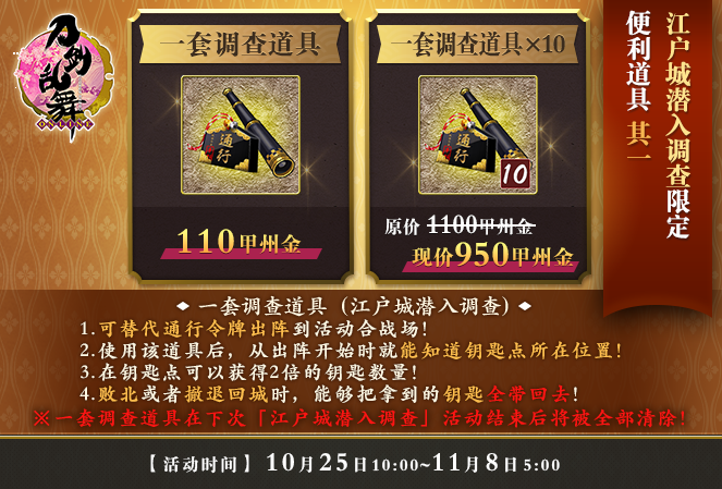 【活动详情】活动期间,江户城限定调查道具上架。使用一套调查道具,可替代通行令牌出阵到活动合战场;使用道具后从出阵开始时就能知道钥匙点所在位置,且在钥匙点能够获得2倍数量的钥匙;同时,当败北或撤退回城时,可以将获得的钥匙全带回去!一套调查道具单个售价110甲州金。一套调查道具x10原价1100甲州金,每日首次购买特惠价为950甲州金。