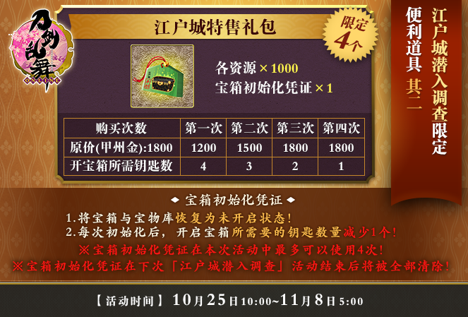 【活动详情】活动期间,江户城特售礼包限量上架。礼包内含各资源*1000、宝箱初始化凭证*1,原价1800甲州金,第一次购买特惠1200甲州金,第二次购买特惠1500甲州金,第三次与第四次购买分别是1800甲州金。宝箱初始化凭证能够将宝箱与宝物库恢复为未开启状态;同时,每次初始化后,开启宝箱所需要的钥匙数量将减少1个!