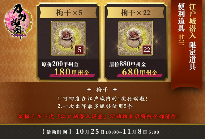 【活动详情】活动期间,江户城潜入调查限定便利道具梅干全新上架。在江户城内出阵时使用梅干,每个可回复1次行动数!梅干x5礼包原价200甲州金,现价180甲州金;梅干x22礼包原价880甲州金,现价680甲州金。两款礼包均享受每日首次购买特惠。