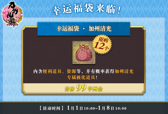 1月1日至1月8日活动期间,游戏内万屋将上架加州清光幸运福袋。开启专属极化道具幸运福袋,有机会获得资源、便利道具、刀装和刀剑男士专属极化道具。开启全部12个福袋必得一套对应刀剑男士的专属极化道具。新的一年怀抱新的期冀,与刀剑男士共同开拓无限可能,解放更强的力量!希望送加州清光去修行的审神者请千万不要错过机会!