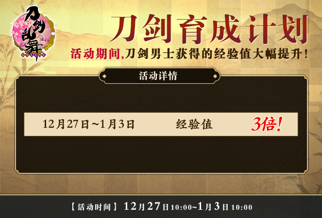 12月27日至1月3日活动期间,刀剑男士获得的经验值提升至3倍!请审神者不要错过育成刀剑男士的时机。同时,多种经验符礼包上架万屋特卖,搭配使用能够助力刀剑男士更快成长!