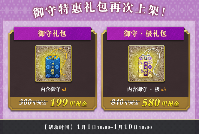 新年御守特惠,护航战力成长!1月1日至1月10日活动期间内,万屋将上架两款御守特惠礼包。两款礼包皆为每日首次购买打折,请各位审神者不要错过机会!