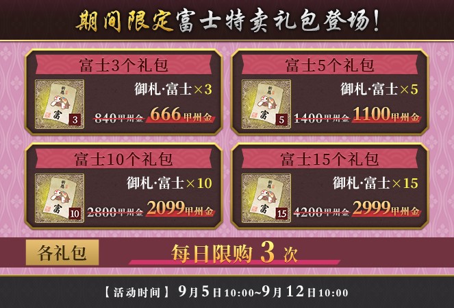 为应援虎彻兄弟概率UP活动,4款富士特卖礼包将上架万屋特卖。富士3个礼包内含御札·富士*3,原价840甲州金,现价666甲州金;富士5个礼包内含御札·富士*5,原价1400甲州金,现价1100甲州金;富士10个礼包内含御札·富士*10,原价2800甲州金,现价2099甲州金;富士15个礼包内含御札·富士*15,原价4200甲州金,现价2999甲州金。以上各个礼包每日均限购3次。