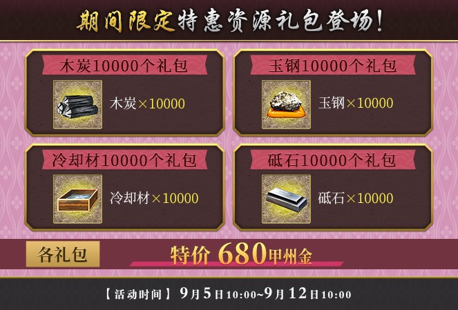 同时,4款特惠资源礼包也将上架万屋特卖。木炭10000个礼包内含木炭*10000;玉钢10000个礼包内含玉钢*10000;冷却材10000个礼包内含冷却材*10000;砥石10000个礼包内含砥石*10000。以上各礼包单个售价均为680甲州金。