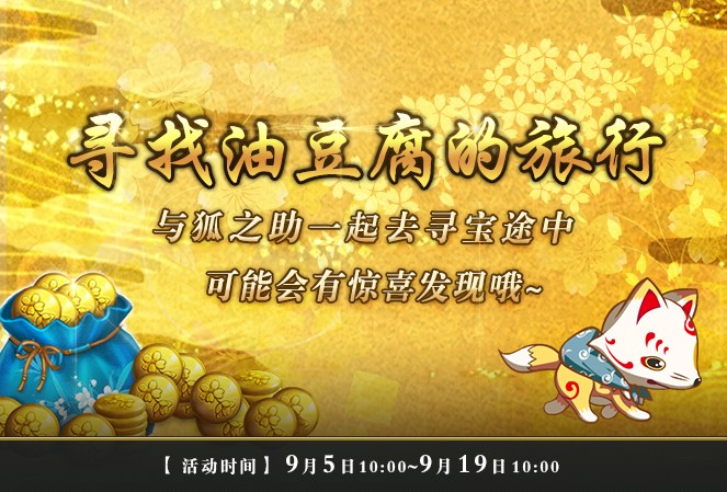 9月5日10:00-9月19日10:00活动期间,审神者可以陪同狐之助一同踏上寻找油豆腐的旅途。在旅途中,购买油豆腐会提高狐之助的幸福度。狐之助幸福度越高,到达终点时审神者可得到的回报就越好。