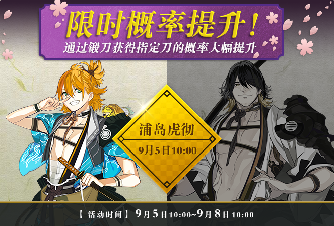 首先,虎彻兄弟迎来久违的锻刀概率限时提升活动!9月5日10:00-9月8日10:00期间,审神者通过锻刀功能获得「胁差·浦岛虎彻」的概率大幅提升;9月8日10:00-9月12日10:00期间,审神者通过锻刀功能获得「打刀·长曾祢虎彻」的概率大幅提升。